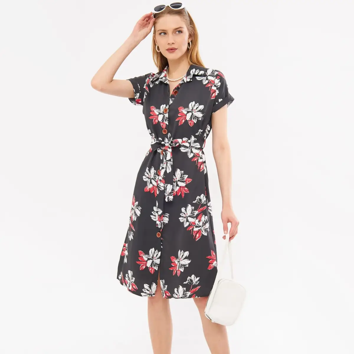 Anthracite Large Floral, Waist Belted Short Sleeve Shirt Dress